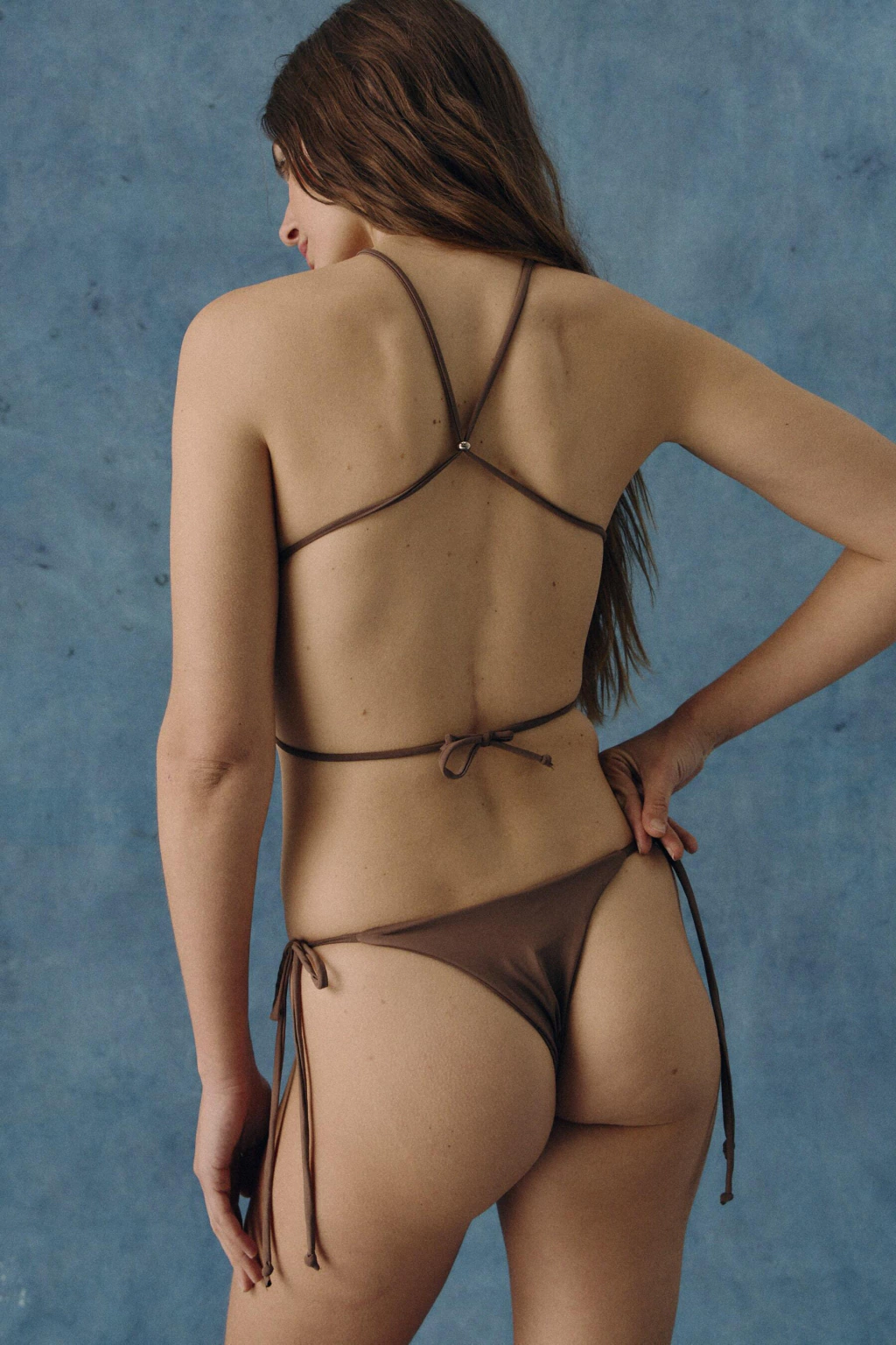 La bombacha es semi less y tiene tiritas regulables en sus laterales.