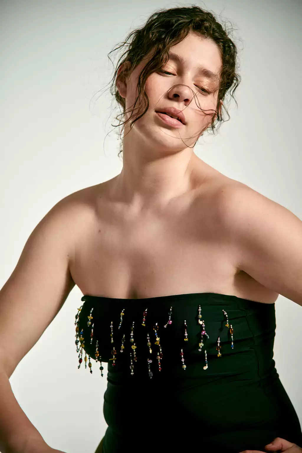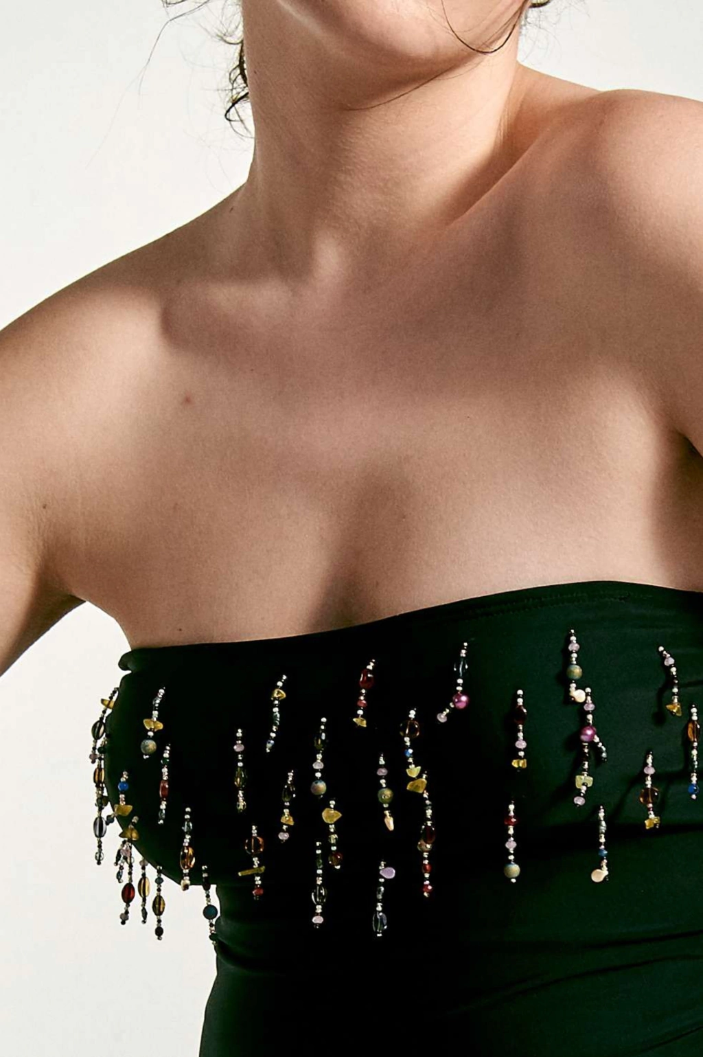 L’imperatrice tiene un bordado abstracto con movimiento ya que son tiritas de cuentas de 3cm aproximadamente en la parte superior del corpiño en el frente de la pieza. Las cuentas son de vidrio checo y piedras naturales.